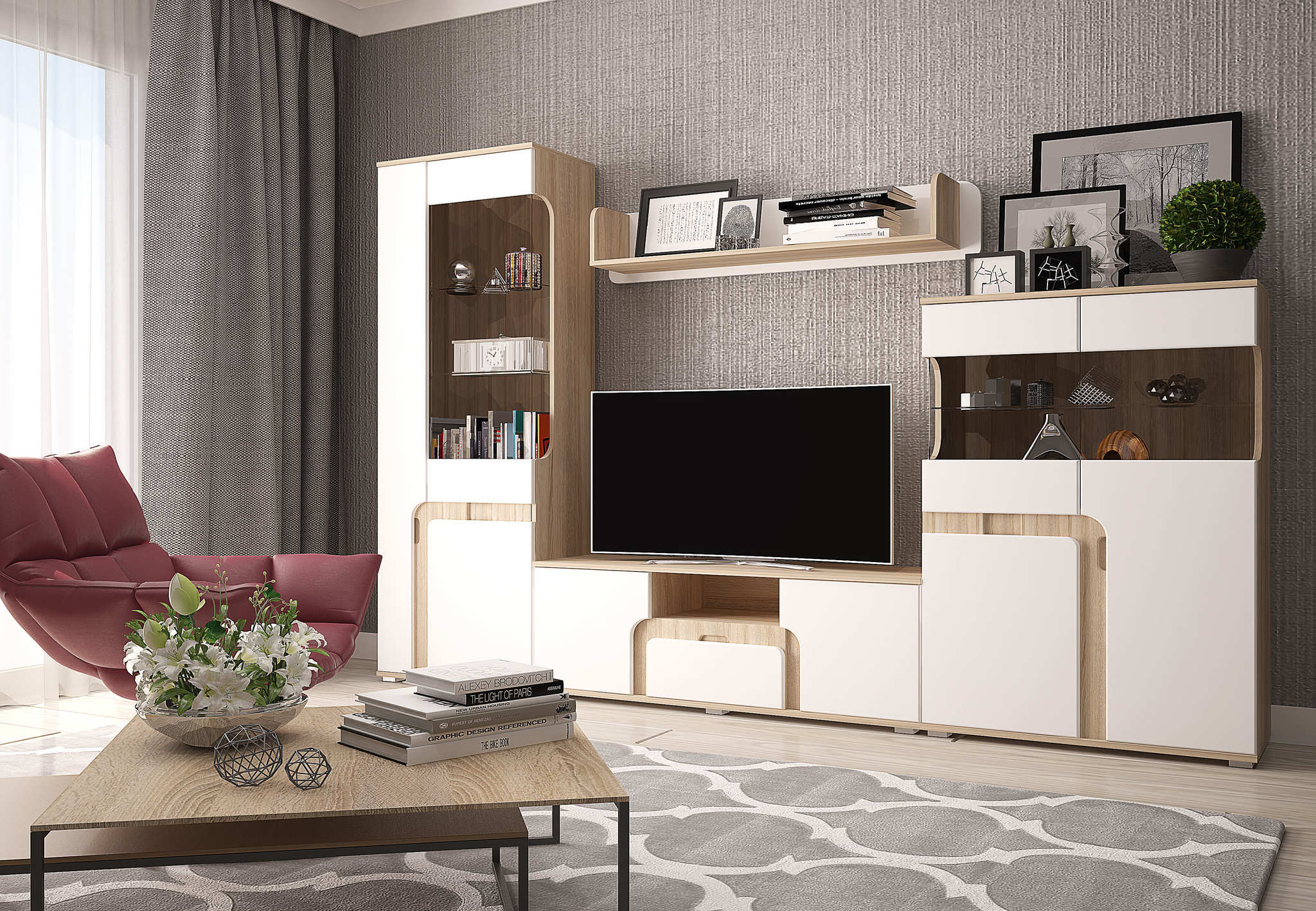 Марсель привлекает внимание любителей нестандартной мебели. Фасады фасады сделаны в оригинальной объемной абстракции, которая как раз выполняет роль ручек, что смотрится очень стильно и свежо для современного интерьера. Для увеличения полезного пространства к гостинной продается вместительный шкаф.